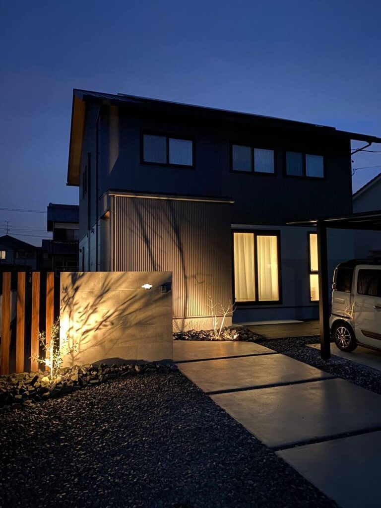 ここに植栽の陰影を移す事で家全体で見た時に雰囲気が格段にアップしてシンプルながら美しい外構になっていますね。